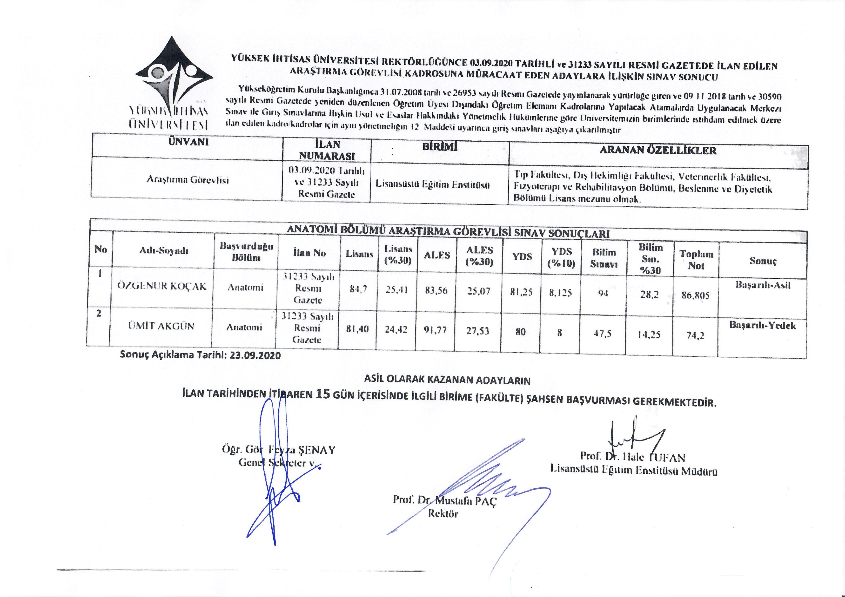 Lisansüstü Eğitim Enstitüsü Öğretim Elemanı Alım Sonuçları.