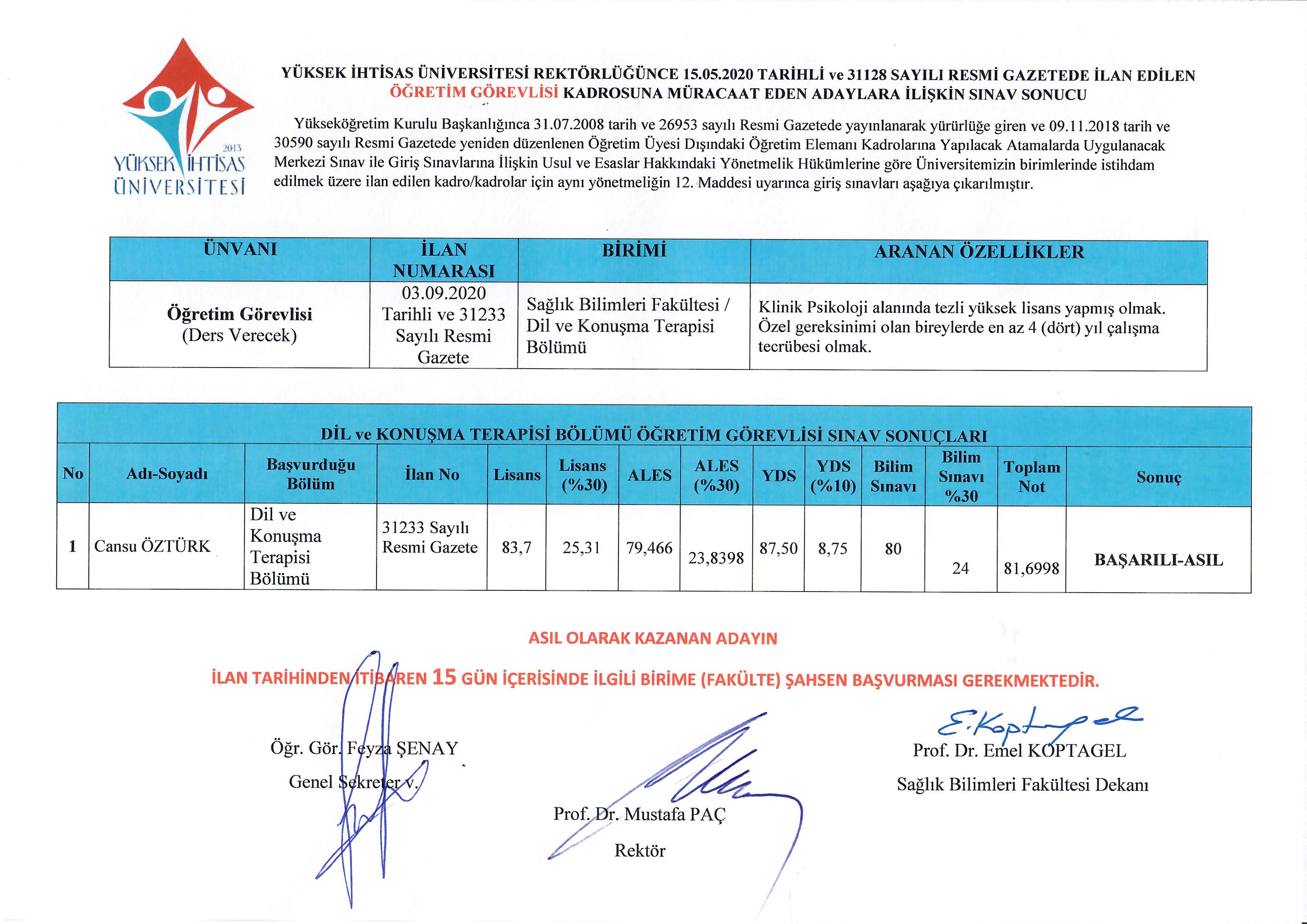 Sağlık Bilimleri Fakültesi Öğretim Elemanı Alım Sonuçları.