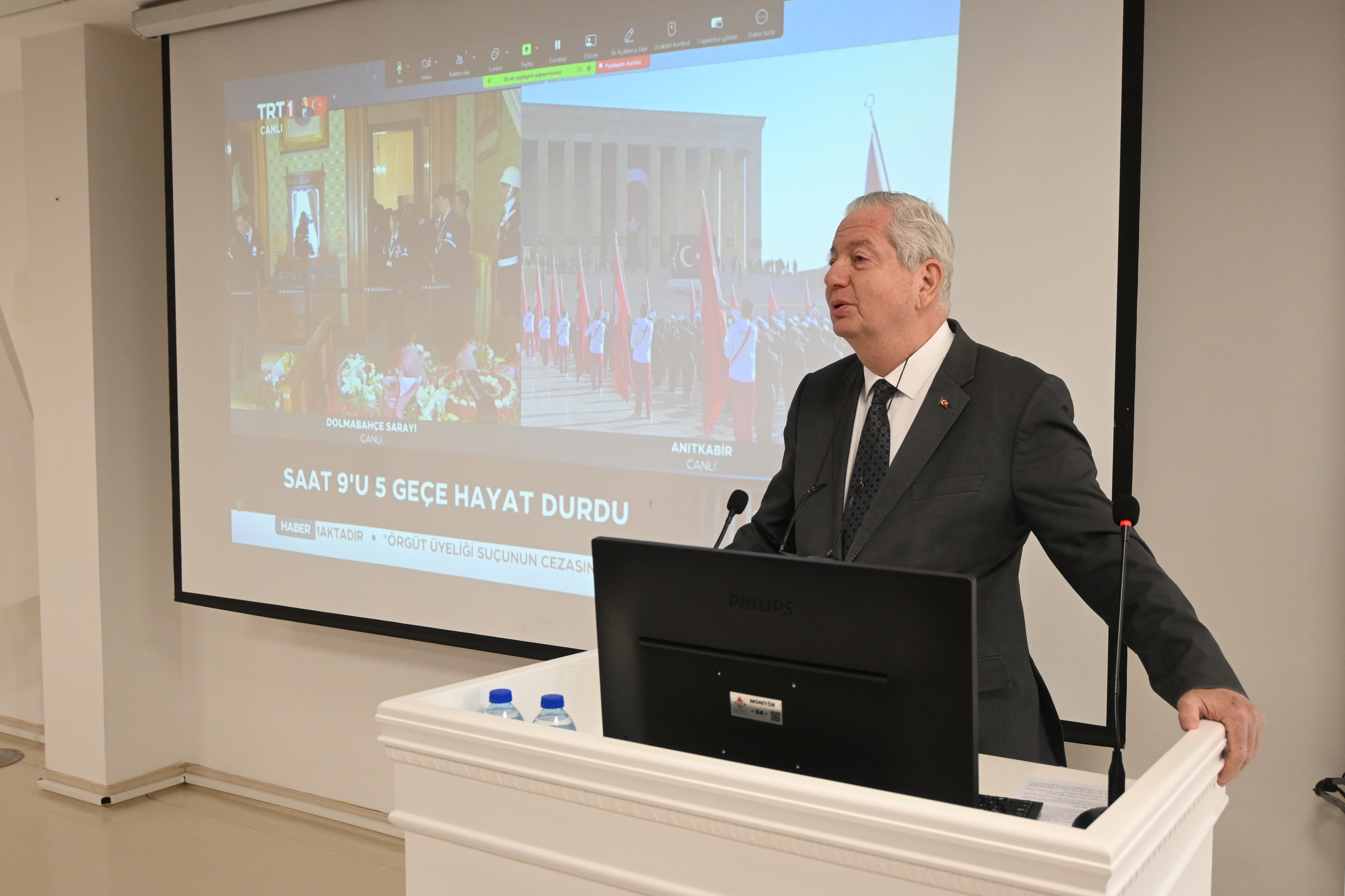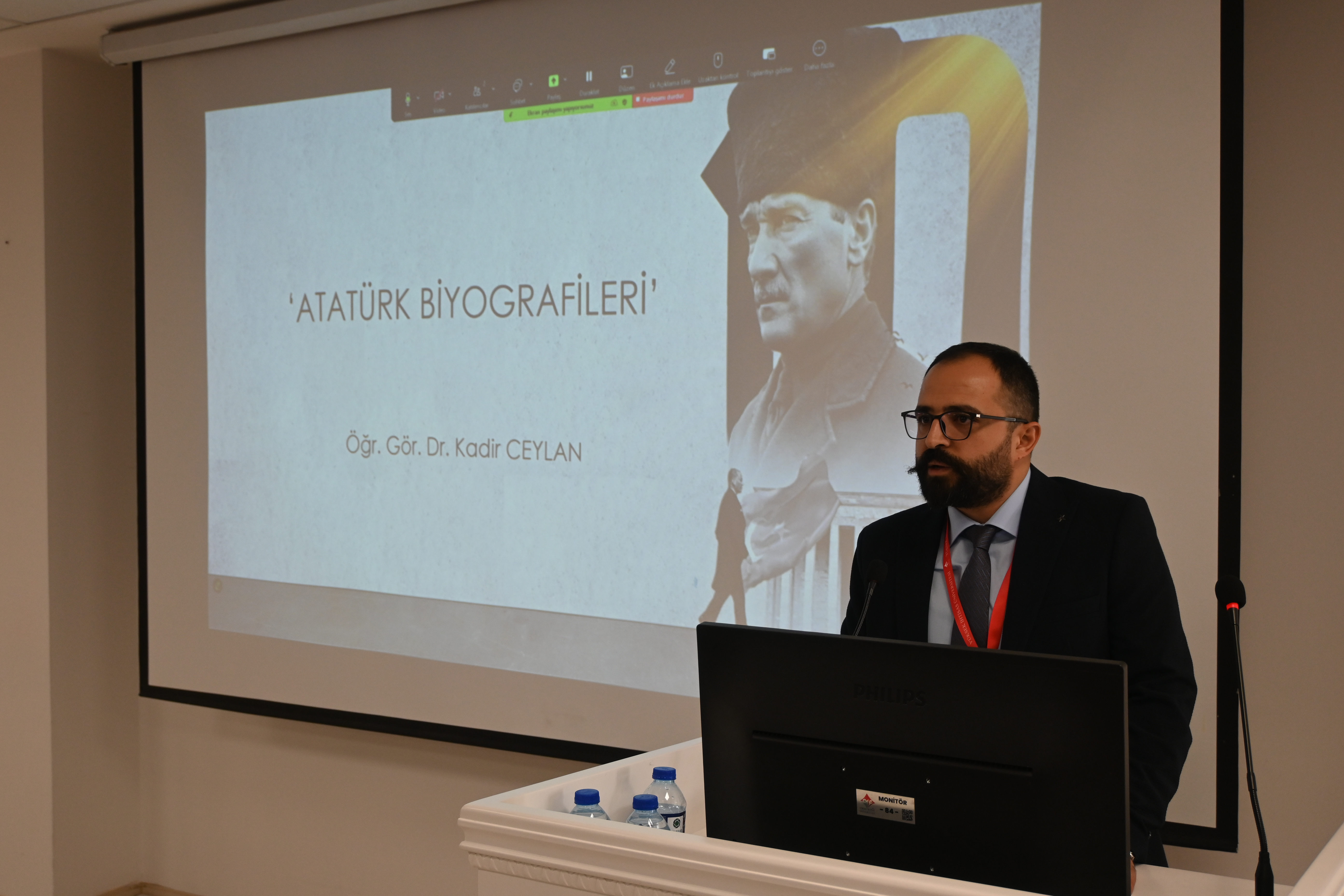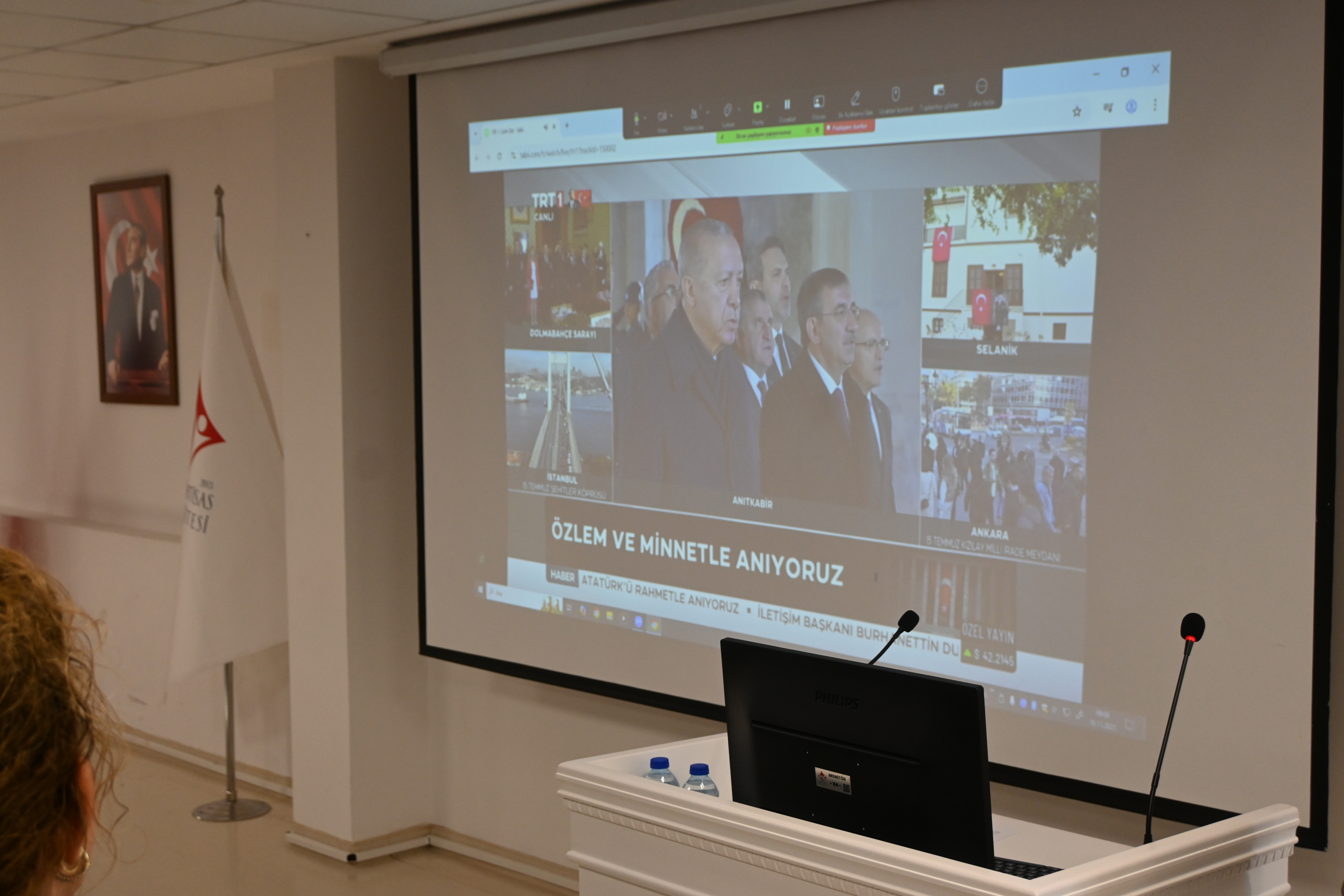 Üniversitemiz 100. Yıl Yerleşkesi Konferans Salonunda düzenlenen 10 Kasım Atatürk’ü Anma Programı, saygı duruşu ve İstiklal Marşı’nın okunmasının ardından Rektörümüz Prof. Dr. Kadirhan SUNGUROĞLU’nun açılış konuşmasıyla başladı. Program, Öğr. Gör. Dr. Kadir CEYLAN’ın “Atatürk Biyografileri” sunumuyla devam etti. Ulu Önder Mustafa Kemal Atatürk, sevgi, saygı ve özlemle anıldı.