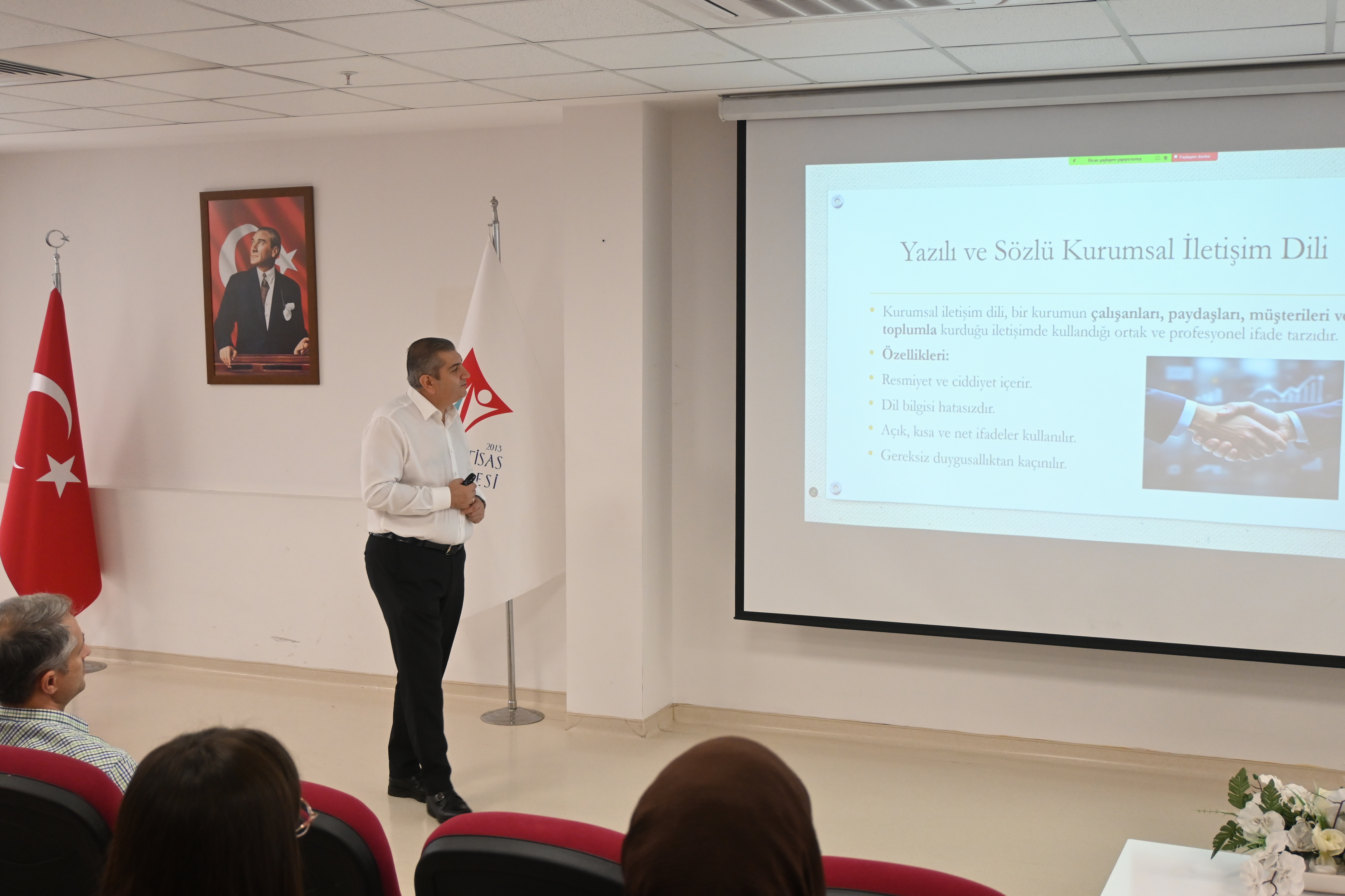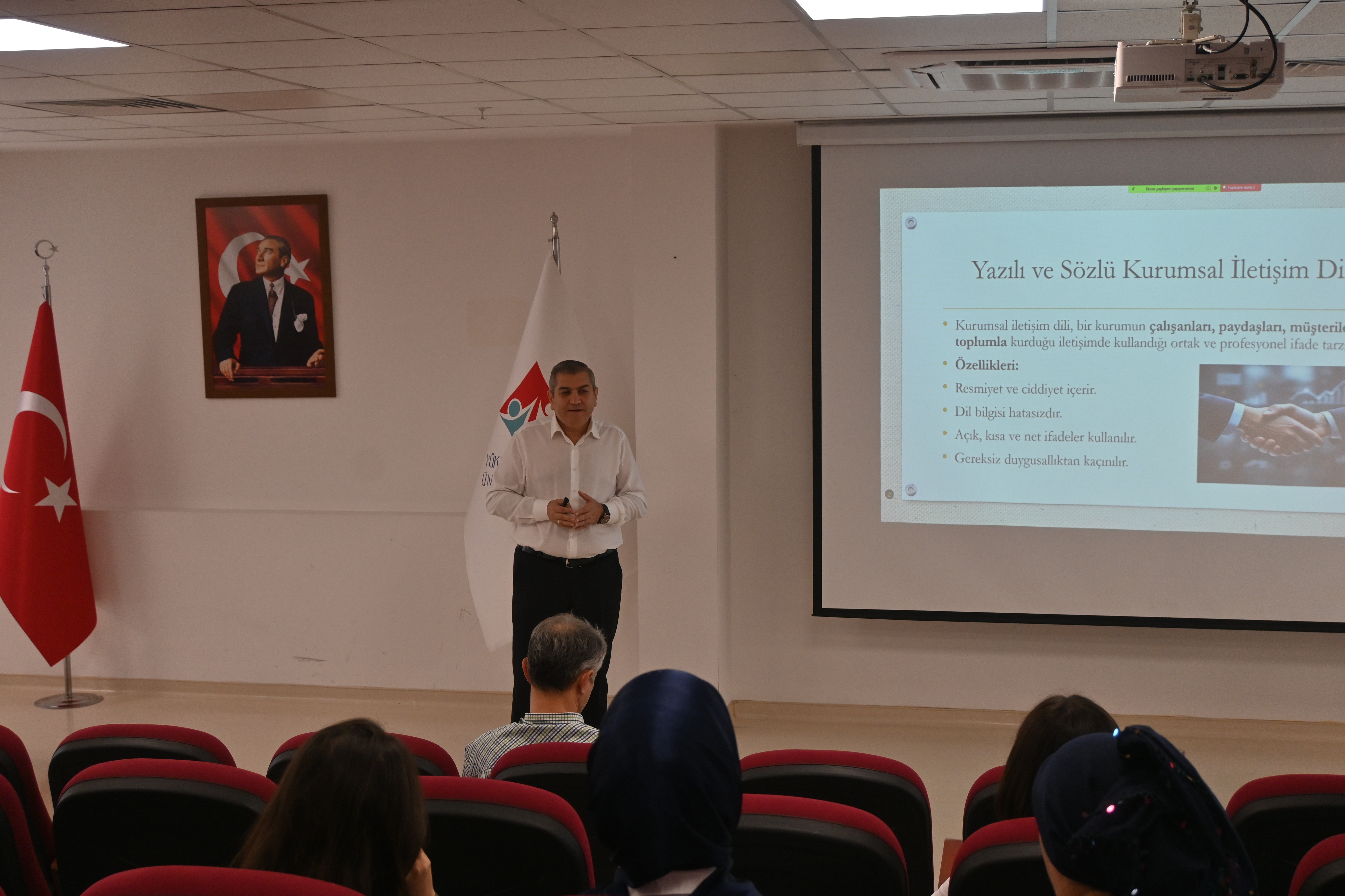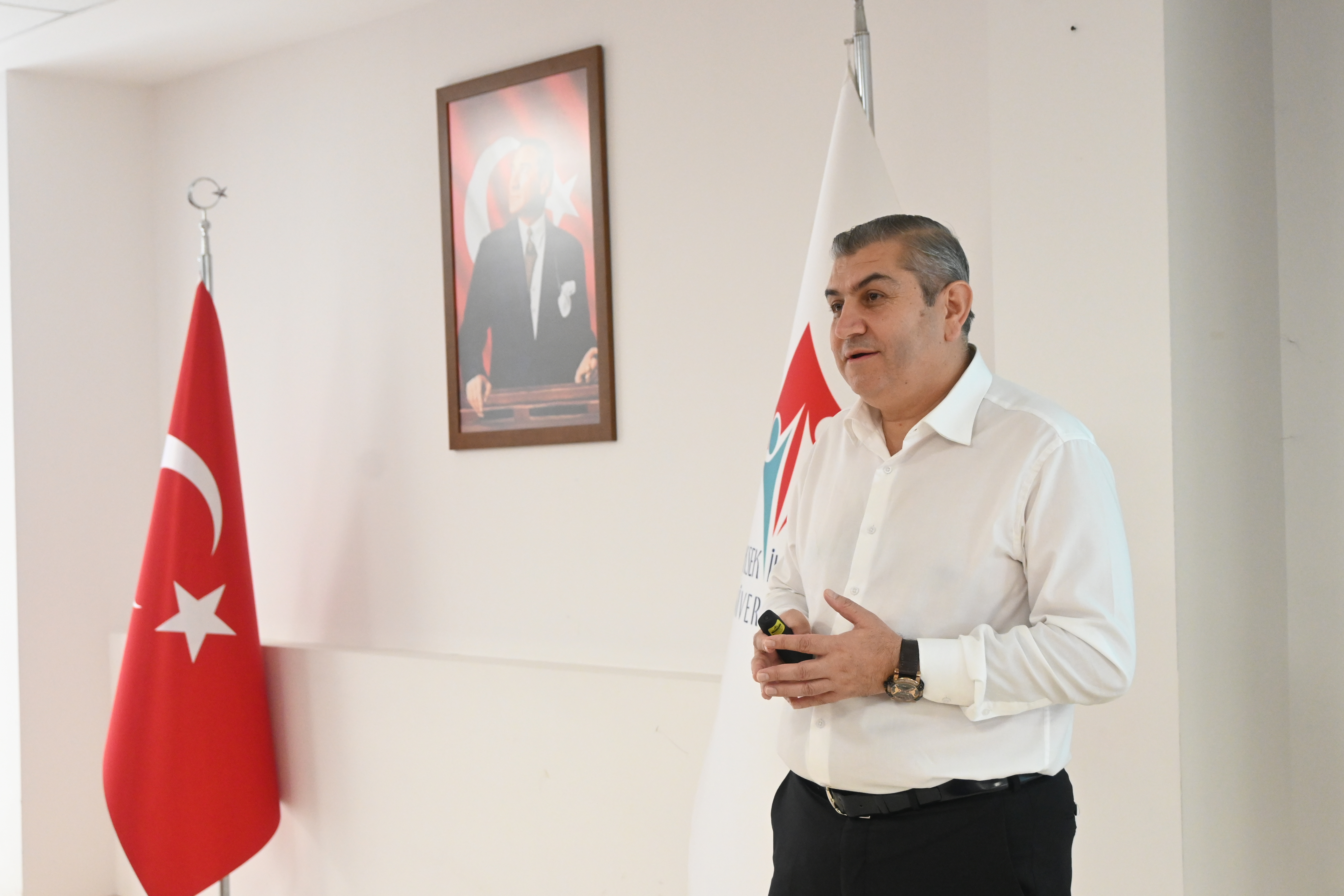 Üniversitemiz 100. Yıl Yerleşkesi Konferans Salonu’nda Dr. Öğr. Üyesi Abdulbeşir CEYLAN tarafından “İletişim Becerileri Eğitimi” gerçekleştirildi. Eğitimde, etkili iletişimin önemi, doğru ifade teknikleri ve kişiler arası ilişkilerde iletişim becerilerinin geliştirilmesi konularına değinildi. Katılımcılar interaktif bir ortamda iletişim yöntemleri üzerine bilgi edinme fırsatı buldu.