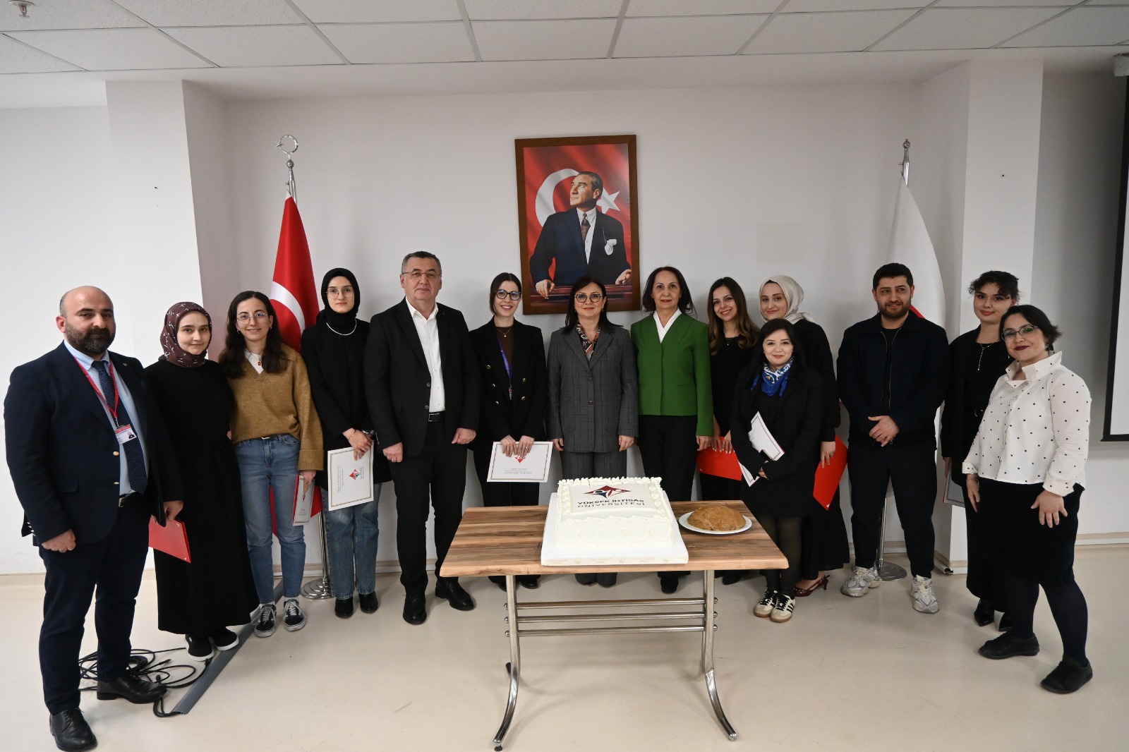 Akademik ve idari kadronun yoğun katılım gösterdiği programda birlik ve beraberlik ön plandaydı. Kutlama kapsamında pasta kesimi gerçekleştirilirken, elde edilen bu başarının üniversitemizin kalite güvencesi yolculuğunda önemli bir adım olduğu ifade edildi. Tüm paydaşların katkısıyla kazanılan bu başarı, gelecekte daha büyük hedeflere ulaşma noktasında güçlü bir motivasyon kaynağı oldu. Program sonunda emeği geçenlere teşekkür belgeleri takdim edildi.